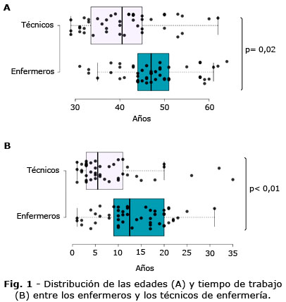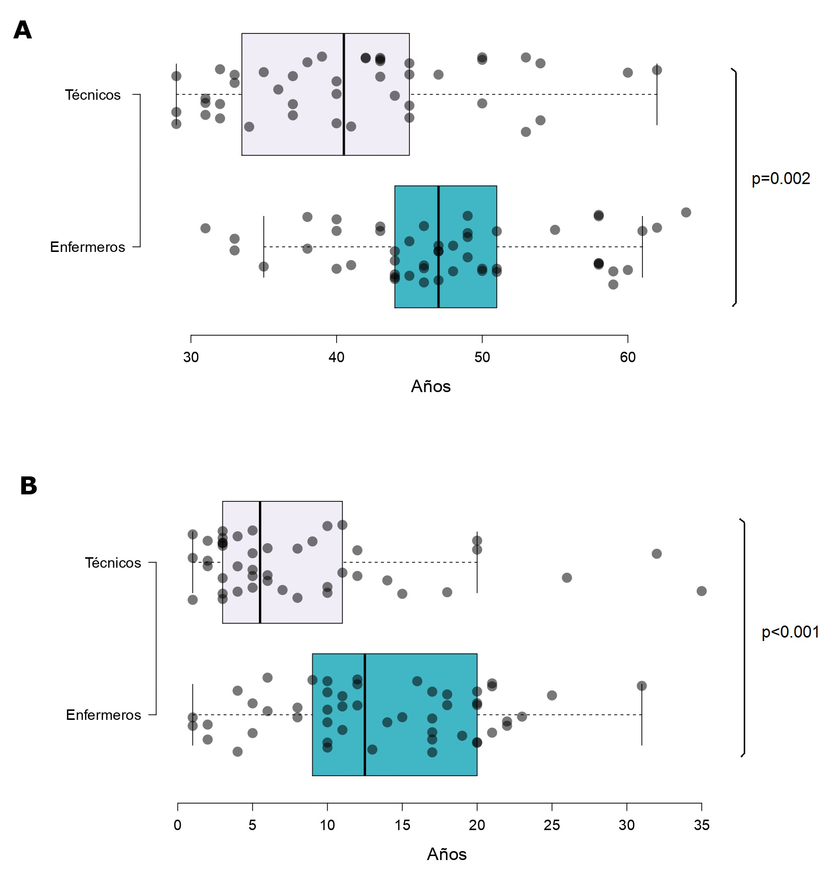 En la figura 1 (Ver figura en alta resolución) se muestran las diferencias según la edad y el tiempo de trabajo de los participantes. Cuando se comparó la diferencia entre los años de servicio, entre los técnicos (8,55 ± 7,94 años) y profesionales de enfermería (13,48 ± 6,98 años) se encontraron diferencias significativas (p< 0,001). De la misma forma, cuando se comparó las edades de los técnicos (41,11 ± 8,46 años) y los profesionales de enfermería (47,84 ± 7,97 años) se hallaron diferencias significativas (p= 0,002).