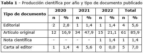 De los 270 documentos indizados en Scopus, 71 contenían temáticas asociadas a la COVID-19, de los cuales 85,9 % eran artículos originales, el 7 % cartas al editor, el 5,6 % editoriales y el 1,4 % notas científicas (tabla 1). Asimismo, se observa que en lo que va del presente año 2022, se publicaron 17 documentos, cantidad inferior a lo publicado en el año 2021 (39 documentos) y superior al año 2020 (15 documentos). Por otro lado, el 95,8 % de los documentos fueron publicaos en español y solo el 4,2 % en inglés.