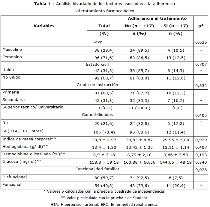 El 78,4 % de los pacientes encuestados reportaron presentar alguna comorbilidad. El promedio de IMC y hemoglobina glicosilada fue de 29,8 y de 8,9, respectivamente. El 59,7 % perteneció a una familia disfuncional y 87,3 % no cumplió de forma óptima con el tratamiento para su enfermedad. Se evidenció una asociación significativa entre la funcionalidad familiar (funcional o disfuncional) y la adherencia al tratamiento (p= 0,028) (tabla 1).
