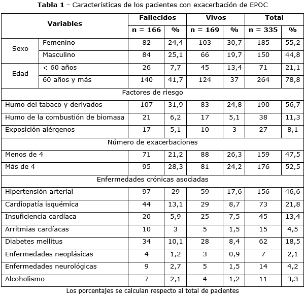 En la tabla 1 pueden apreciarse las características de los pacientes. Predominó el sexo femenino con 185 (55,2 %) y el grupo etario de 60 años y más, con 264 (78,8 %). Se constató que el 56,7 % estuvieron expuestos al humo del tabaco y derivados; el 52,5 % tenía antecedentes de más de 4 exacerbaciones en el último año. Al considerar las enfermedades crónicas asociadas, la HTA estuvo presente en 156 pacientes (46,6 %), la cardiopatía isquémica en 73 (21,8 %) y la diabetes mellitus en 62 (18,5 %).