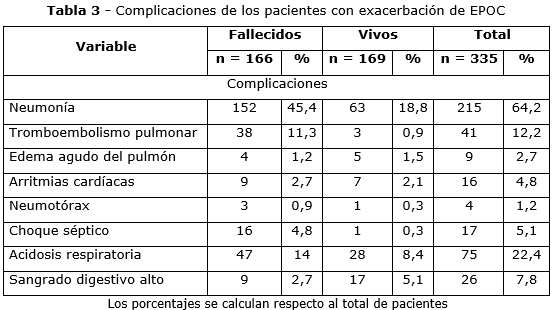La tabla 3 expone las complicaciones en pacientes con exacerbación de la EPOC. La neumonía fue la más frecuente en 215 (64,2 %), la acidosis respiratoria en 75 (22,4 %) y el tromboembolismo pulmonar en 41 (12,2 %) pacientes.