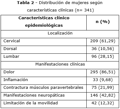 La distribución de las características clínicas se muestra en la tabla 2. Existió predominio de afectación del segmento cervical de la columna vertebral. Las manifestaciones clínicas que con mayor frecuencia se presentaron fueron el dolor, las manifestaciones neuropáticas y la contractura de los músculos paravertebrales.