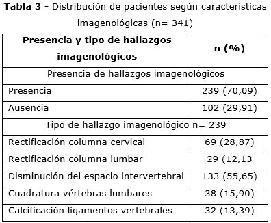 En la tabla 3 se muestra que existió un predominio de pacientes con presencia de hallazgos imagenológicos. La disminución del espacio articular y la rectificación de la columna cervical fueron los hallazgos más frecuentemente identificados.