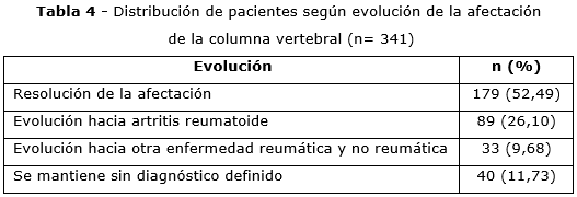 En la tabla 4 se observa que el 52,49 % de las pacientes, según su evolución clínica, resolvió su cuadro de afectación de la columna vertebral; un 26,10 % evolucionó hacia una artritis reumatoide y el 9,68 % evolucionó hacia otra enfermedad reumática. En el momento de realizar el estudio el 11,73 % de las pacientes aún no tenían un diagnóstico definido.