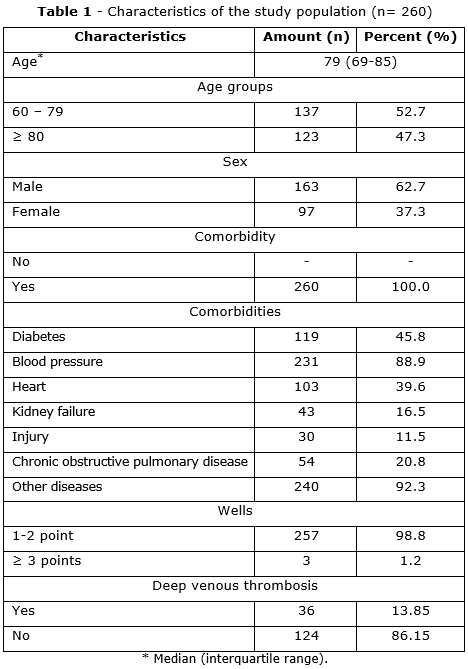 Doctors use the Wells score to screen for the risk of deep venous thrombosis, and most studies have used it. In the study sample it accounted for most of the patients at average risk (98.9%) with 1-2 points. The results of the study by Schouten et al.(8) shows the rate with 47.1% of patients with Wells score ≤ 1. This difference can be explained because the author's sample differs from the current study.