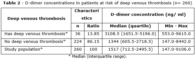 The D-dimer concentration of patients with deep venous thrombosis had a median of 3106.5 ng/mL and was about 1.5 times higher than that of patients without deep venous thrombosis. In addition, all patients with deep venous thrombosis had a D-dimer limit above 500 ng/mL, in the group of patients without deep venous thrombosis, the D-dimer concentration was up to 8442.0 ng/mL (table 2)
