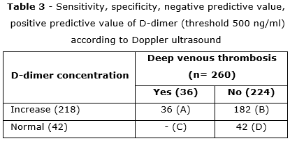 When compared with the diagnostic criteria of Doppler ultrasound, with a threshold of D-dimer concentration of 500 ng/mL, the specificity of the method is low (16.51%), but the sensitivity is high (100%), and the positive predictive value is low (18.75%) but the negative predictive value is absolute (100%).