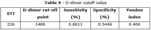 The results suggest that the cut-off point of D-dimer concentration was 1488, corresponding to a sensitivity of 86.11%, a specificity of 54.46% and the highest Youden index of 0.406. (table 4)