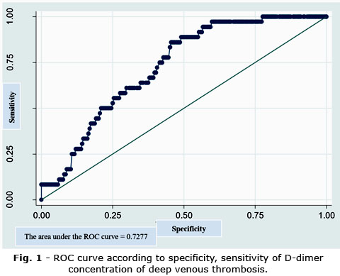 Research results show that the AUC, according to the D-dimer concentration is 0.728. The results suggested that the cut-off point of D-dimer concentration was 1488 ng/mL, corresponding to a sensitivity of 86.11%, a specificity of 54.46%.