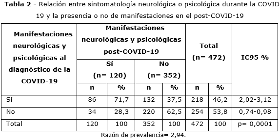 La tabla 2 muestra que 120 pacientes presentaron sintomatología neurológica o psicológica en el post-COVID-19. Según la RP, en quienes tuvieron síntomas al ingreso, la prevalencia de síntomas neurológicos y psicológicos post-COVID-19 fue 2,94 veces mayor.
