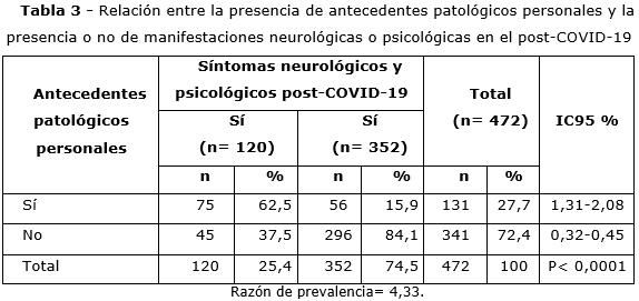 En la tabla 3 se muestra la relación entre los pacientes que presentaron antecedentes patológicos personales (alergias, asma bronquial) y quienes desarrollaron manifestaciones clínicas post-COVID; con una RP 4,33 veces mayor en quienes tuvieron antecedentes patológicos personales.