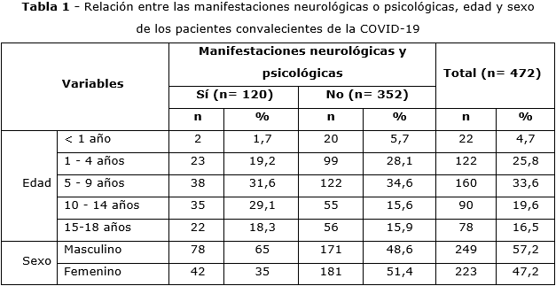 Manifestaciones neurológicas y psicológicas en pacientes pediátricos convalecientes de la COVID-19