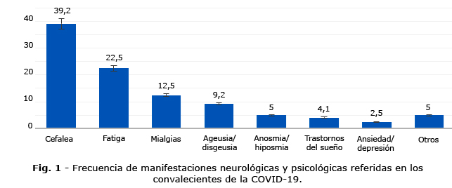 Los síntomas neurológicos más reportados, incluyen déficit de memoria o atención, ansiedad, depresión, fatiga, dolor de cabeza, insomnio, anosmia y ageusia, entre otros.(29) Huang y otros,(30) en una cohorte con 1733 pacientes demuestran que después de 6 meses del alta hospitalaria, 76 % de los pacientes desarrollaron síntomas post-COVID-19; los más frecuentes fueron: Fatiga (63 %), insomnio (26 %), alopecia (22 %), anosmia (11 %), ageusia (9 %) y dificultad en la movilidad (7 %).
