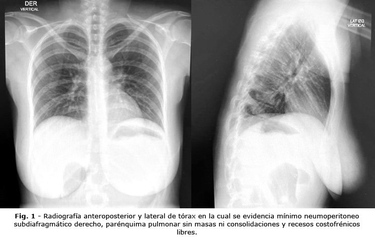con dolor abdominal intenso. Se realizó radiografía de tórax que mostró escaso