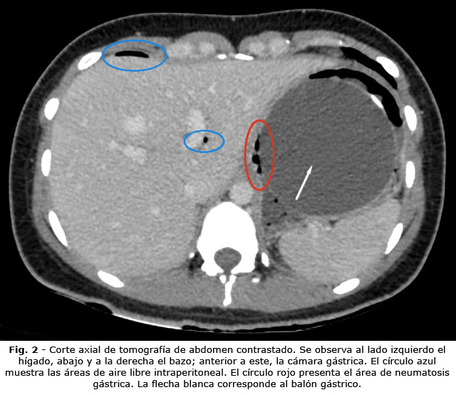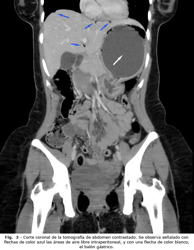 Ante la sospecha de posible perforación secundaria, se decidió solicitar radiografía toracoabdominal de pie, para evaluar la presencia de neumoperitoneo. Se realizó radiografía del tórax en la cual se evidenció neumoperitoneo subdiafragmático derecho reducido (Fig. 1). Se procedió a realizar tomografía axial computarizada (TAC) contrastada de abdomen, que reportó signos que sugerían perforación gástrica (engrosamiento de las paredes del estómago, asociado a neumatosis de la pared y aire libre intraperitoneal) (Fig. 2 y Fig. 3), asociados a cambios inflamatorios intraperitoneales.