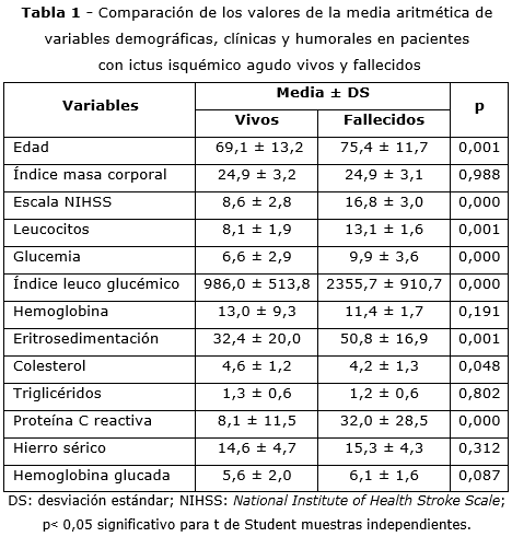 Al comparar los valores de la media de las variables cuantitativas en los pacientes vivos con respecto a los fallecidos, se encuentra en la cohorte de estudio, que resulta significativo estadísticamente: La edad, el déficit neurológico representado por el valor de la escala NIHSS, el valor total de los leucocitos, la glucemia, el índice leuco-glucémico, la eritrosedimentación y la proteína C reactiva. Estos marcadores bio analíticos expresan de forma indirecta la magnitud del daño inflamatorio endotelial desencadenado por la isquemia cerebral.