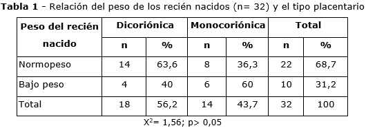 En la tabla 1 se describe el peso del recién nacido, según el tipo de placenta. Hubo mayor frecuencia (60 %) de recién nacidos con bajo peso en las placentas monocoriónicas.