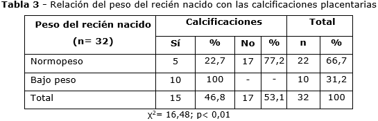 En cuanto a la presencia de calcificaciones placentarias, en el 100 % de los recién nacidos con bajo peso y hubo calcificaciones en las placentas (tabla 3).
