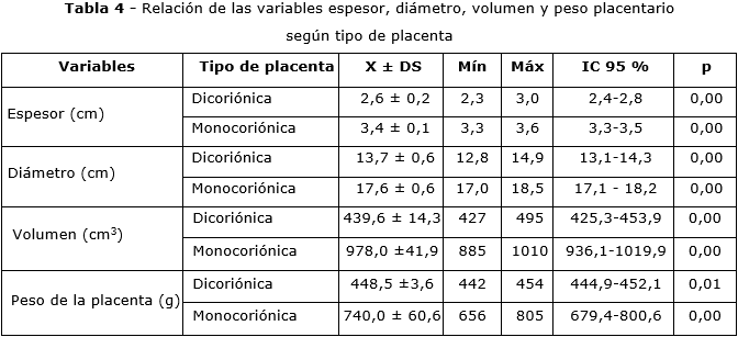 En la tabla 4 se analiza el espesor, el diámetro placentario, volumen y peso según el tipo de placenta. En todos los casos hubo relación estadística altamente significativa (p< 0,05) entre las variables morfométricas con el tipo de placenta.