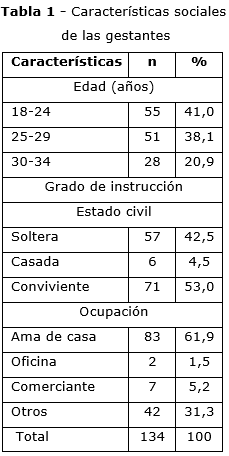 La edad promedio de las gestantes fue de 25,7 años. La mayoría tenía entre 25 y 29 años, estudios hasta secundaria (64,9 %), eran convivientes (53 %) y amas de casa (61,9 %) (tabla 1).