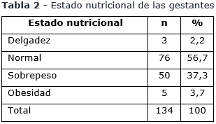 El 56,7 % de gestantes presentó un estado nutricional normal, 37,3 % tuvo sobrepeso, en tanto que, la obesidad (3,7 %) y la delgadez (2,2 %) fueron los menos frecuentes (tabla 2).