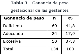 El 80,1 % de las gestantes tuvo una deficiente ganancia de peso; el 37,3 % y 17,9 % tuvo una excesiva y adecuada ganancia de peso, respectivamente (tabla 3).