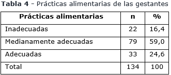 El 24,6 % de gestantes presentó prácticas alimentarias adecuadas, mientras que, el 16,5 % tuvo prácticas inadecuadas (tabla 4).