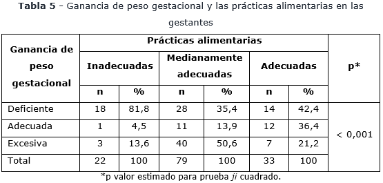La ganancia de peso adecuada fue más frecuente en las gestantes con prácticas alimentarias adecuadas (36,4 %), en comparación a las que presentaron prácticas inadecuadas (4,5 %) o medianamente adecuadas (13,9 %). Además, la ganancia de peso deficiente se presentó en una mayor proporción de gestantes con prácticas inadecuadas (81,8 %). Se demostró que la ganancia de peso durante el embarazo está asociada a las prácticas alimentarias que realiza la mujer en este proceso (p< 0,001) (tabla 5).