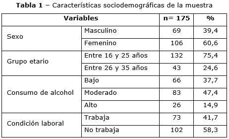 Las otras variables incluidas fueron el sexo (masculino y femenino), grupo etario (entre 16 y 25 años y entre 26 y 35 años), nivel de consumo de alcohol (se consideraron los niveles bajo, moderado y alto teniendo como referencia el autorreporte del patrón de consumo de bebidas alcohólicas durante el último año) y condición laboral (se consideró si trabajaban de manera estable o solo se dedicaban a estudiar).