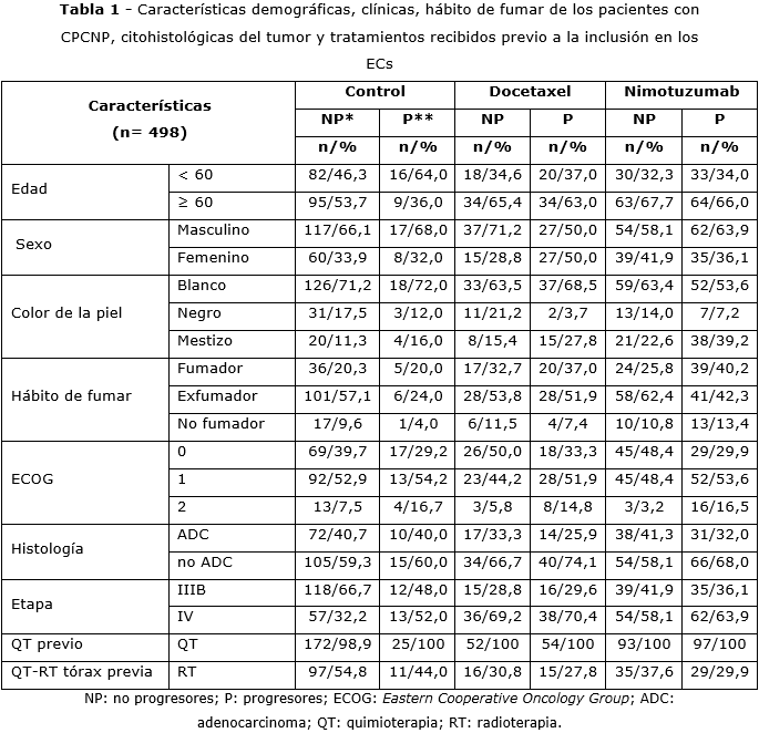 El universo del estudio quedó constituido por 498 pacientes con CPCNP en estadios avanzados, que recibieron tratamiento de primera línea con quimioterapia (QT) o QT-radioterapia (RT); estos individuos se clasificaron en: no progresores (n= 322) y progresores (n= 176) según los criterios de evaluación de respuesta de tumores sólidos (RECIST por sus siglas en inglés).