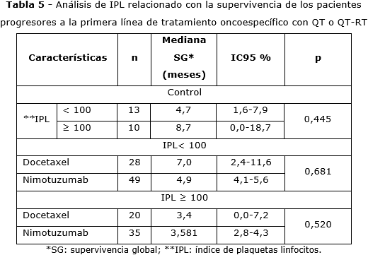 En la tabla 5 se muestra que el IPL en pacientes progresores no refleja valor pronóstico, ni predictivo cuando se analizan a los individuos tratados con nimotuzumab.