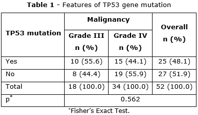 Many recent studies have shown the association of TP53 gene mutations in developing and promoting HGG.(8,9) However, data on the association of TP53 gene mutations with HGG treatment outcomes are quite limited.(10) Therefore, determining the association between TP53 gene mutation and treatment outcome in HGG patients have great significance for disease prognosis, relapse prediction, and treatment outcome monitoring. This study had as objective to investigate the association between the TP53 gene mutation and some characteristics of treatment outcomes in HGG patients.
