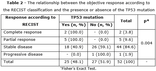 Patients with p53 mutation expression had a better RECIST response (100% of patients with complete and partial response) than patients without expression of this gene mutation. This difference was statistically significant with p< 0.05 (table 2).