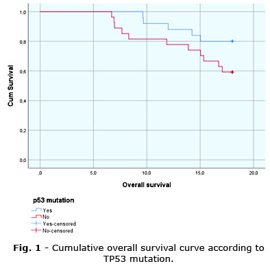 the TP53 mutation (χ2= 6.7; p= 0.010). The overall survival in the