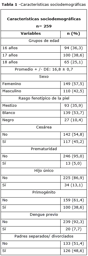 Se incluyeron en el estudio 259 adolescentes, de ambos sexos, que cursaban entre 10mo y 12mo grado. Se excluyeron los estudiantes cuyos cuestionarios no se completaron debido a no estar presentes en el momento de recogida de los datos.