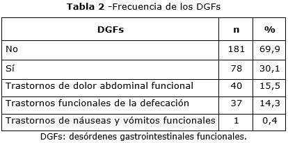 De la muestra en estudio 78 (30,1 %) estudiantes cumplieron los criterios diagnósticos de Roma IV para algunos de los DGFs. El grupo de trastornos de dolor abdominal funcional fue el más común dentro de los DGFs con 40 adolescentes, lo que representó el 15,5 % (tabla 2).