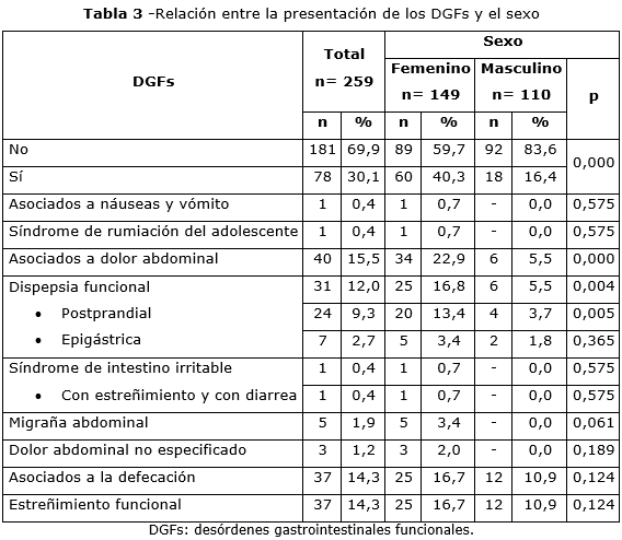En la tabla 3 se muestra que los DGFs predominaron en los adolescentes del sexo femenino (40,3 %) con una significación de p =0,000. El trastorno más frecuente fue el estreñimiento funcional (EF) (14,3 %), seguido de la dispepsia funcional (12 %).