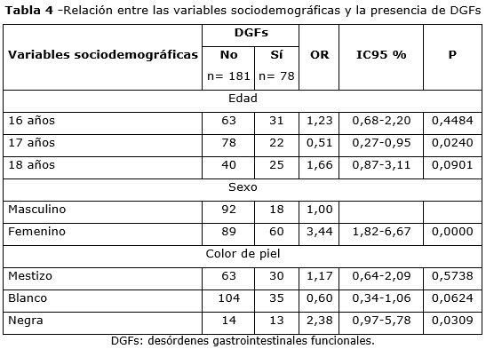 Las variables sociodemográficas de los adolescentes con y sin DGFs fueron comparadas (tabla 4). El análisis relevó que el sexo femenino presentó 3,44 veces mayor riesgo de desarrollar un desorden digestivo funcional que el masculino (p= 0,0000) y el color de piel negra 2,38 veces más riesgo que el resto (p= 0,0309).