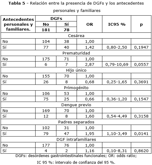 En la tabla 5 se evidenció la relación entre la presencia de los DGFs y los antecedentes personales y familiares. El análisis estadístico muestra que en el caso de los adolescentes con padres separados o divorciados tiene valor significativo con 1,95 veces más probabilidad de desarrollar algún los DGFs (p= 0,0141).