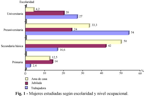 Entre las féminas con nivel preuniversitario predominan las trabajadoras (Fig. 1) con 54,0 %, seguido por el universitario con 27,0 % y la frecuencia de escolaridad primaria es de solo 2,4 %. Entre las jubiladas y amas de casa, los porcentajes mayores estuvieron representados por aquellas con secundaria básica y la escolaridad primaria fue más frecuente que en las trabajadoras.