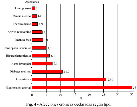 En la figura 4 aparecen las afecciones crónicas declaradas por las mujeres estudiadas. La hipertensión arterial fue la que se presentó con mayor frecuencia en un 35,0 %, le sigue la osteoartrosis con 25,9 % y en tercer lugar la diabetes mellitus con un 10,7 %; no es despreciable la hipercolesterolemia, que la mencionan 19 mujeres para el 6,1 %.