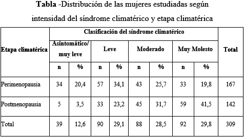 Hubo un predominio de mujeres en la perimenopausia, lo cual se corresponde con que los grupos de edades más jóvenes estuvieron más representados en la investigación. Las mujeres en la postmenopausia fueron las más afectadas, pues clasificaron con mayor frecuencia como síndrome climatérico moderado y muy molesto, con 31,7 % y 41,5 % respectivamente.