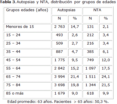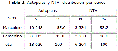 En la distribución por sexos (tabla 2) se registró un predominio del sexo masculino, tanto en las autopsias realizadas (55,2 %) a pacientes egresados fallecidos, como en el diagnóstico de NTA (53,2 %).