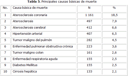 El shock (22,3 %), la bronconeumonía (16,3 %) y el edema pulmonar (11,3 %), constituyeron las principales causas directas de muerte planteadas en los egresados fallecidos autopsiados (tabla 4) en los que se estableció diagnóstico de NTA. La aterosclerosis coronaria (18,5 %) fue la principal causa básica de muerte en los fallecidos analizados (tabla 5).