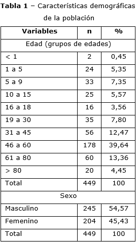 Las características sociodemográficas de los sujetos incluidos aparecen en la tabla 1, en la cual se destaca el predominio de los individuos entre 46 y 60 años de edad (39,64 %) y del sexo masculino (54,57 %).