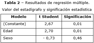 La regresión múltiple arrojó como resultado una influencia positiva (relación directa) de la variable edad (tabla 2) en los valores de creatinina. Esto era algo esperado y solo se realizó para comprobar dicho supuesto.