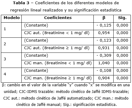 Se hizo una regresión lineal simple para construir las ecuaciones de corrección, para lo que se utilizó como variable independiente, las concentraciones de creatinina sérica mensuradas por los 2 métodos que se precisaban corregir y como variable dependiente la mensuración de creatinina por el método CJC IDMS trazable (gold standard).