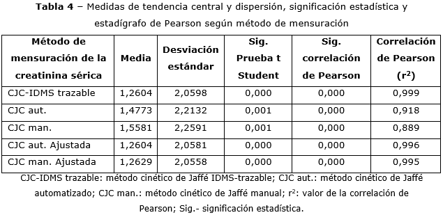 Luego de obtenidas las 4 ecuaciones; 2 para el método CJC aut., una para creatinina < 1 mg/dl y otra para creatinina = 1 mg/dl, y otras 2 para el método CJC man., una para creatinina < 1 mg/dl y otra para creatininas = 1 mg/dl; se calcularon los valores corregidos y se compararon con los no corregidos mediante la prueba t de Student para comparación de medias y prueba de correlación de Pearson.