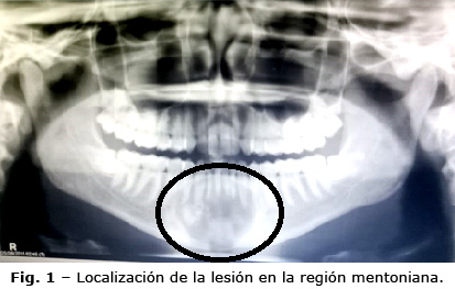 Imagenológico: el examen radiográfico extraoral (vista panorámica) mostró una imagen mixta de elementos radiolúcidos y radiopacos con aspecto punteado, sin reacción perióstica proliferativa y desplazamiento de raíces dentarias (Fig. 1).