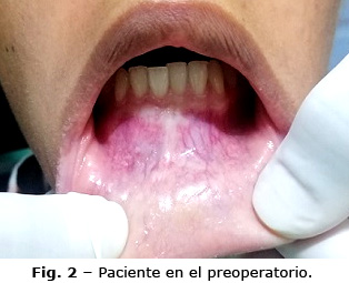 Paciente femenina de 23 años de edad, con antecedentes de salud aparente, de color de piel blanca, procedencia urbana y estudiante de Medicina. Acudió a la consulta con la preocupación de un aumento de volumen de crecimiento progresivo, acompañado de ligero apiñamiento dentario, molestias durante la masticación y alteraciones de la sensibilidad en dientes anteroinferiores.